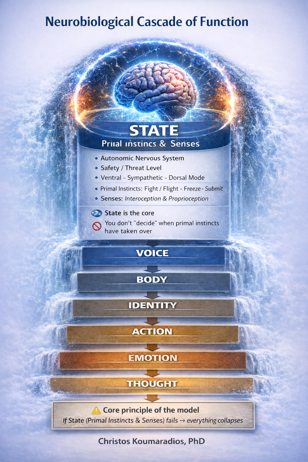 Το μοντέλο τοποθετεί το State οριζόμενο ως η προ-γνωσιακή οργάνωση του αυτόνομου νευρικού συστήματος, η εκτίμηση ασφάλειας–απειλής, τα πρωτογενή ένστικτα και η αισθητηριακή ολοκλήρωση ως τον κεντρικό ρυθμιστή όλων των κατώτερων και ανώτερων λειτουργιών. Υποστηρίζουμε ότι όταν το State απορρυθμίζεται, η πρόσβαση στη βουλητική δράση, την συναισθηματική επεξεργασία και τη γνωσιακή ευελιξία καταρρέει, καθιστώντας τις top-down γνωσιακές προσεγγίσεις ανεπαρκείς.